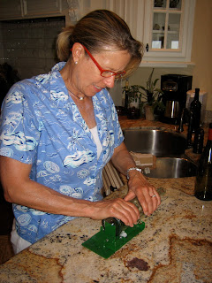 Place your bottle onto the bottle cutter. Using both hands, gently but firmly rotate your bottle, like you see Stephanie doing in the picture above. You will hear a scratching noise,this is good thing. When you hear a pop,stop turning the bottle,this is an indication your bottle is etched all the way round. Set your bottle a side. Now you need your tea pot with boiling water.